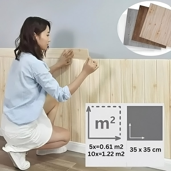 Vsako pakiranje vsebuje 5 kosov (35×35 cm), ki pokrivajo 0,61 m². Pred začetkom izračunajte, koliko paketov boste potrebovali glede na površino stene. Za večje prostore kupite več paketov in uživajte v količinskih popustih!