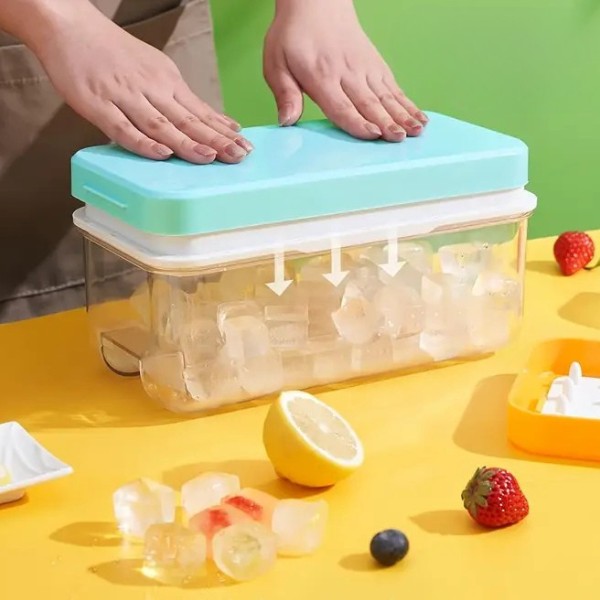 Ko je led pripravljen, preprosto obrnite posodo, pritisnite pokrov in opazujte, kako ledene kocke padejo v posodo. Brez težav, brez nereda.