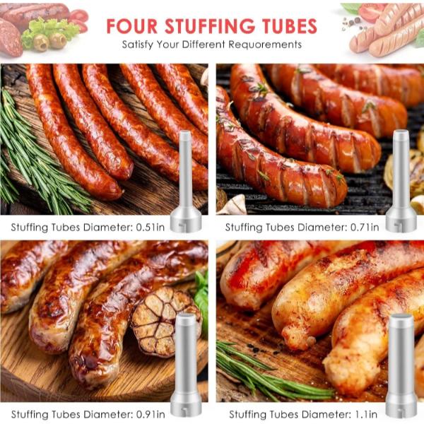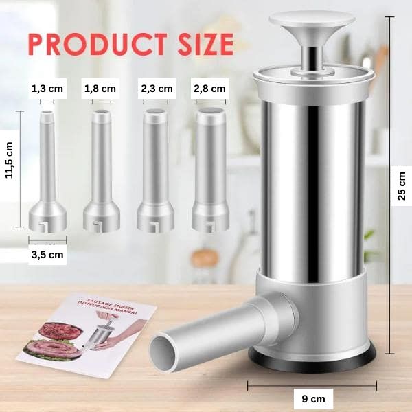 Ta polnilec klobas vključuje štiri šobe iz PP z različnimi premeri: 1,3 cm. 1,8 cm, 2,3 cm in 2,8 cm.