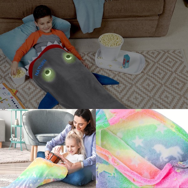 Mehek, visokokakovosten flanelast flis poskrbi, da je otrokom toplo, medtem ko se sproščajo po šoli ali se umirijo za noč. Odlična je za crkljanje na kavču med gledanjem risank ali za ohranjanje toplote v hladnih nočeh. Vaši otroci se bodo hihitali od veselja, ko se bodo zavili v rep morskega psa ali morske deklice.