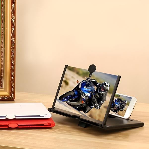 V sodobno zasnovanem in trpežnem ohišju se nahaja zložljiv 3D povečevalnik zaslona za pametni telefon, ki je po velikosti primeren za to, da ga nosite s seboj v službo, na izlete ali kamorkoli drugam.